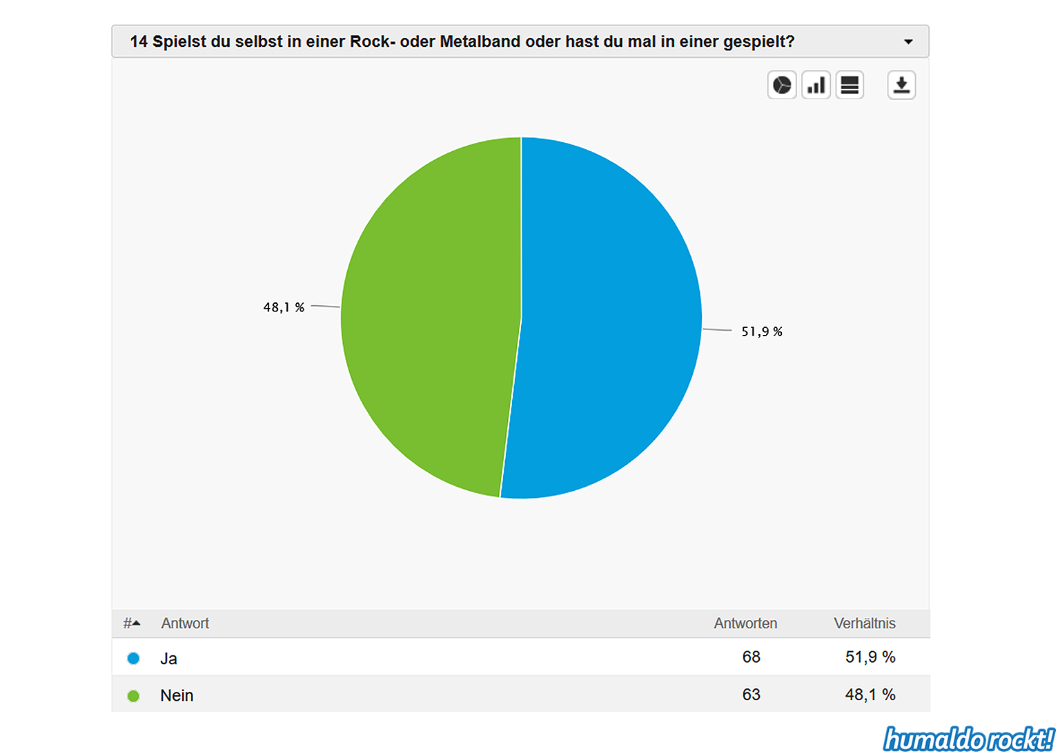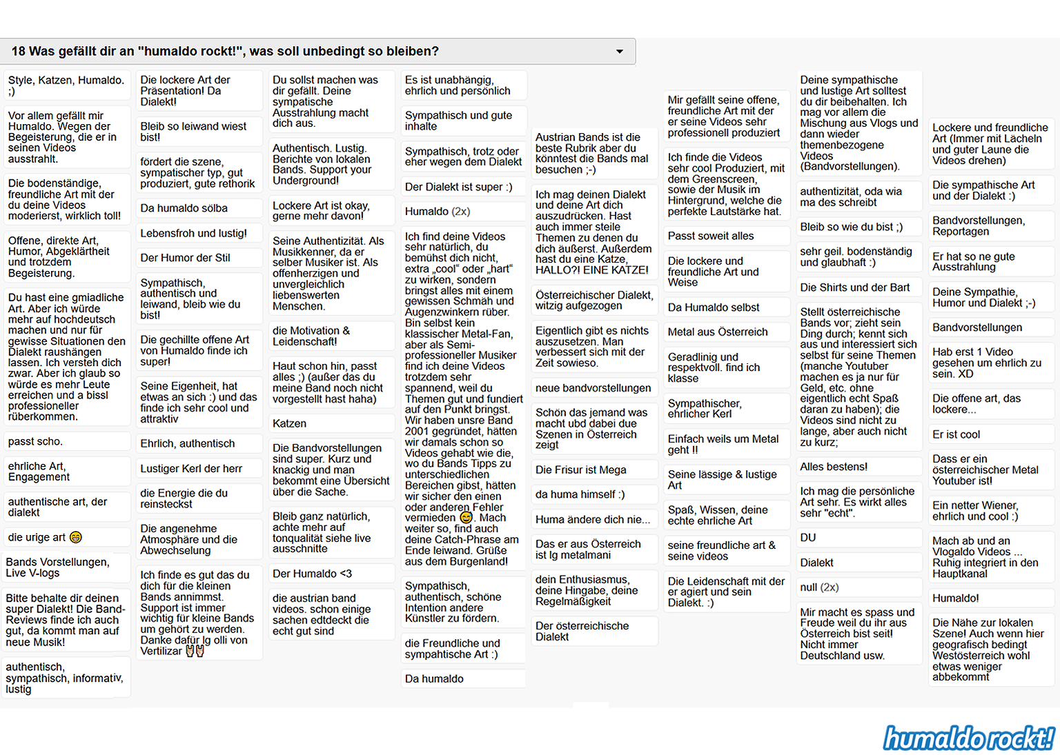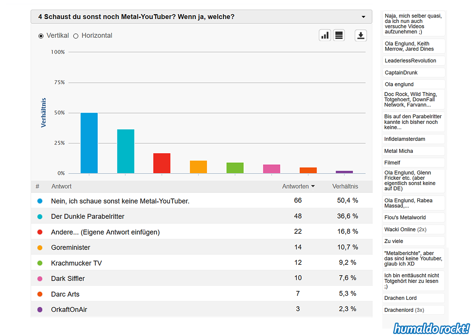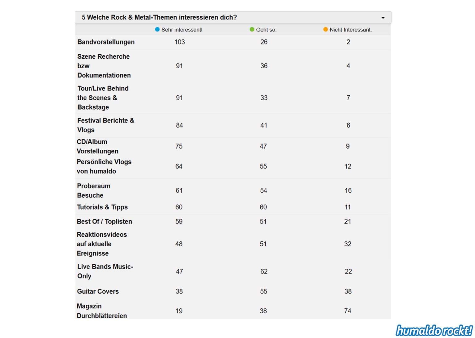 Ergebnisse der humaldo rockt! Umfrage vom Sommer 2018 1. September 2018 Die Ergebnisse der großen humaldo rockt! Umfrage vom Sommer 2018 sind da! Das könnte dir auch gefallen: 20:21 Das Area53 FESTIVAL 2021 findet statt! Alle Infos & Interview mit den Veranstaltern 🤘🤘🤘 9. Juni 2021 16:06 Wenn Musiker, Berühmtheiten und Idole sterben… ⚰️ 7. April 2021 Midriff • Huge Grant • Projekt Steinhof • Dystrust • Ghidrah | AUSTRIAN 🤘🤘🤘 BANDS #1 25. Januar 2018 13:31 METAL ON THE HILL 2021 • Festival Bericht 18. August 2021 humaldo macht videos. // vlogaldo #027 26. Mai 2019 humaldo goes INTERNATIONAL 🤘🤘🤘 • Internationaldo #01 13. September 2022 Keine Lust mehr aufs Blablabla-Vloggen • #dienstalk ☕️ 14. März 2023 Wie es 2026 hier weitergeht. Und überhaupt: IST HIER NOCH JEMAND?! 20. Januar 2026 Metal-Gossip NERVT. (Alternativtitel: BLABBERMOUTH knallhart ENTLIKED!!!) 30. April 2019