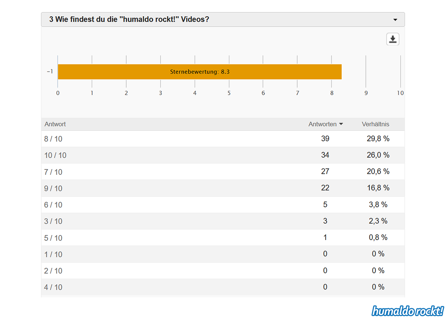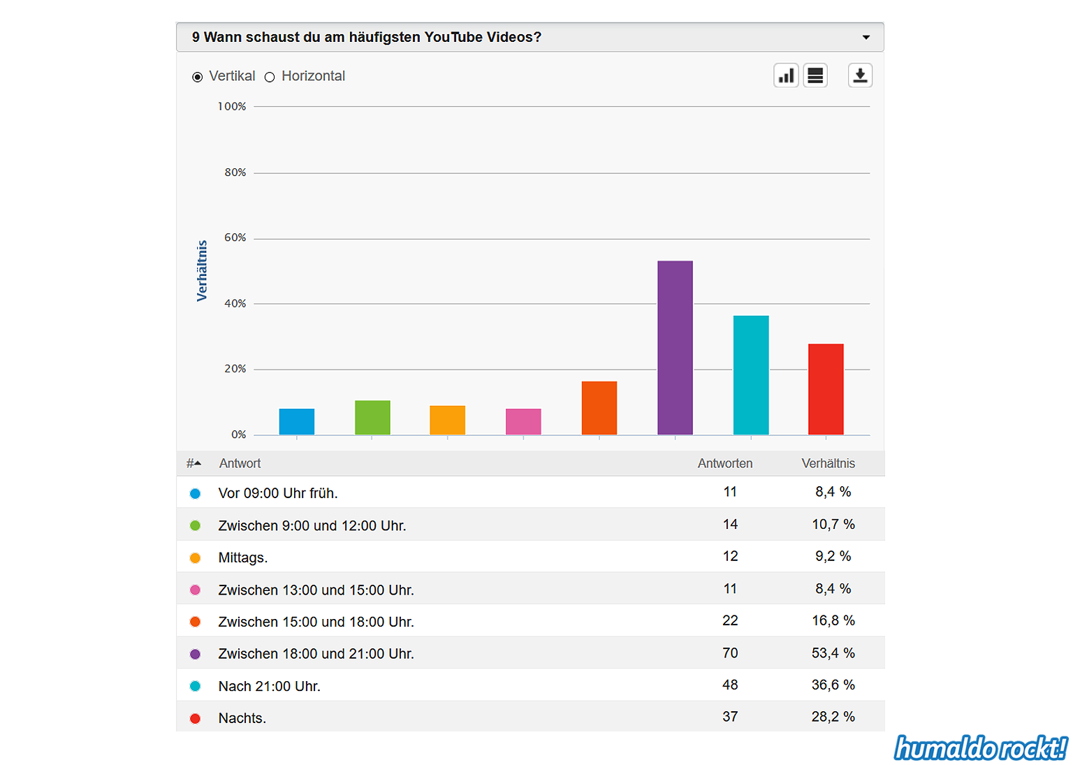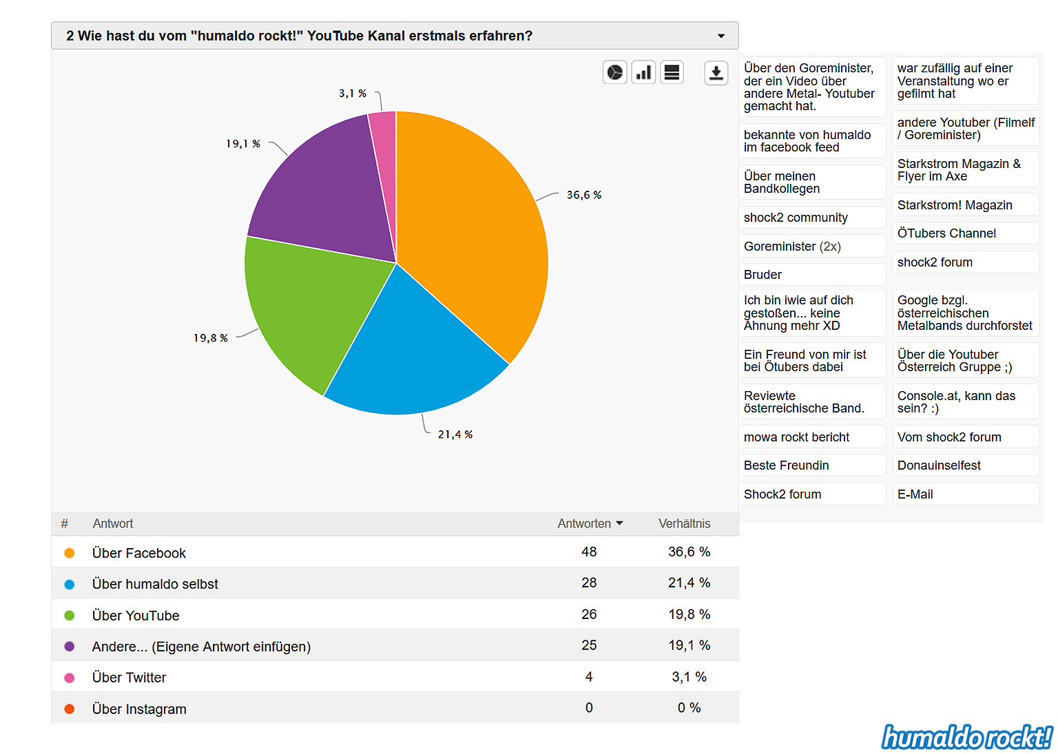 Ergebnisse der humaldo rockt! Umfrage vom Sommer 2018 1. September 2018 Die Ergebnisse der großen humaldo rockt! Umfrage vom Sommer 2018 sind da! Das könnte dir auch gefallen: 20:21 Das Area53 FESTIVAL 2021 findet statt! Alle Infos & Interview mit den Veranstaltern 🤘🤘🤘 9. Juni 2021 16:06 Wenn Musiker, Berühmtheiten und Idole sterben… ⚰️ 7. April 2021 Midriff • Huge Grant • Projekt Steinhof • Dystrust • Ghidrah | AUSTRIAN 🤘🤘🤘 BANDS #1 25. Januar 2018 13:31 METAL ON THE HILL 2021 • Festival Bericht 18. August 2021 humaldo macht videos. // vlogaldo #027 26. Mai 2019 humaldo goes INTERNATIONAL 🤘🤘🤘 • Internationaldo #01 13. September 2022 Keine Lust mehr aufs Blablabla-Vloggen • #dienstalk ☕️ 14. März 2023 Wie es 2026 hier weitergeht. Und überhaupt: IST HIER NOCH JEMAND?! 20. Januar 2026 Metal-Gossip NERVT. (Alternativtitel: BLABBERMOUTH knallhart ENTLIKED!!!) 30. April 2019